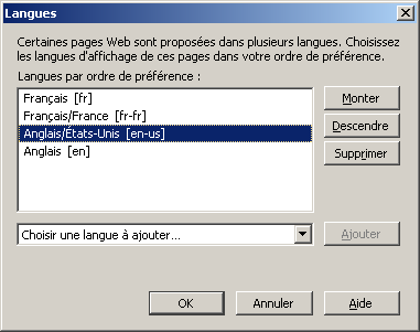 open the menu and popup "Tools, Options, Content, Language ... Choose" and move "Anglais [en]" to the first place: